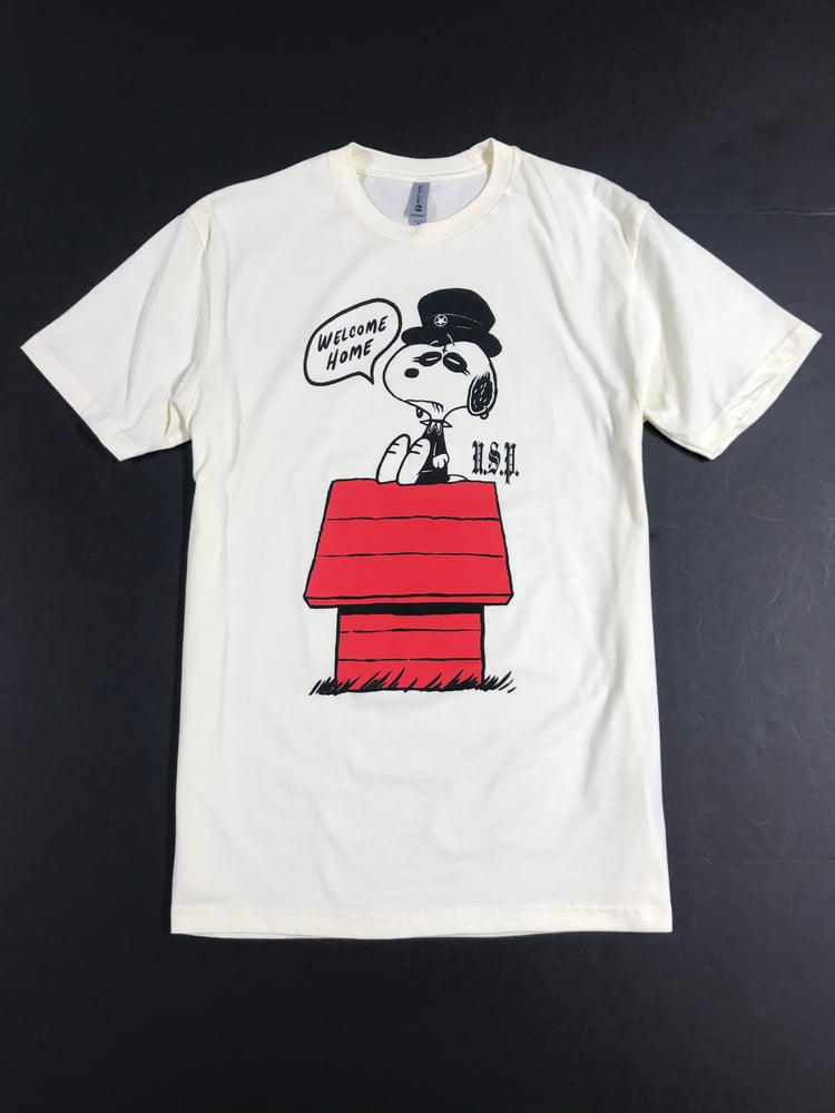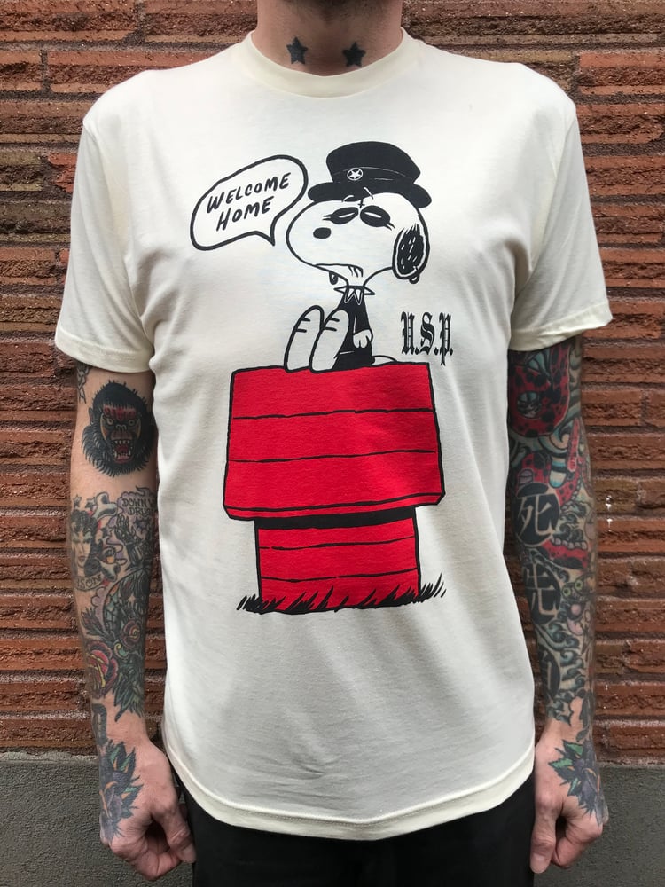 Image screen printed by hand on an off-white natural 100% cotton tee.