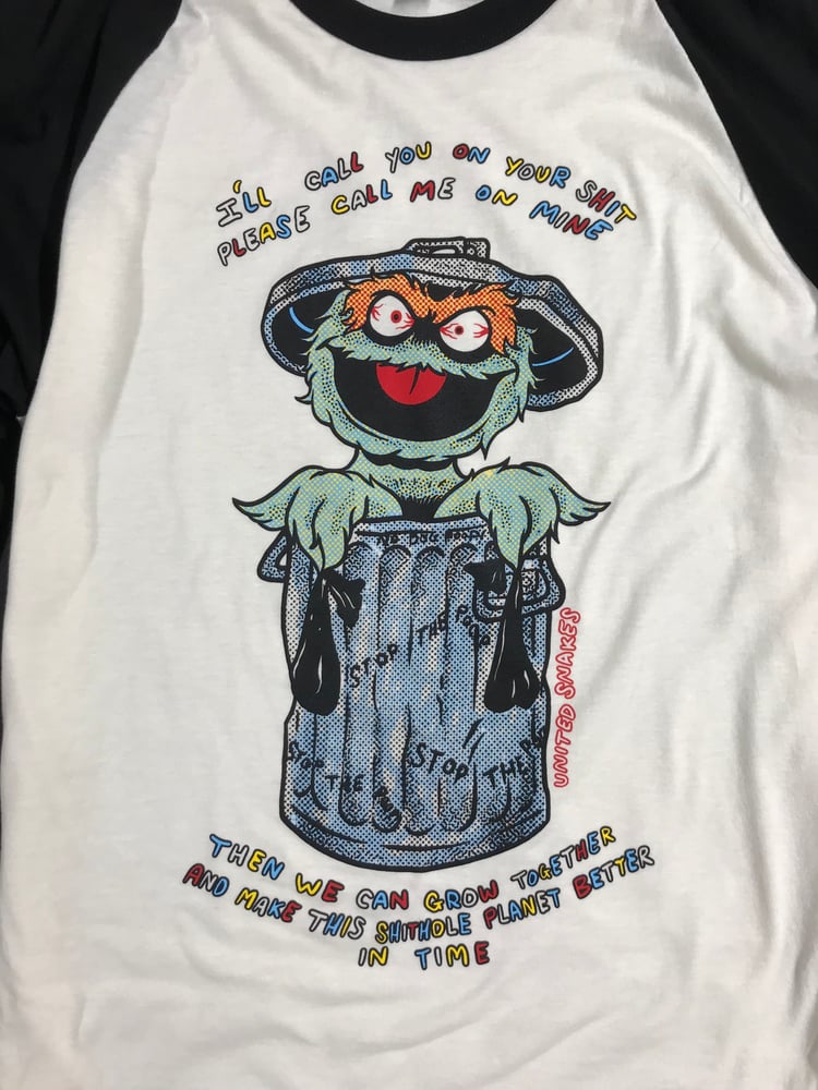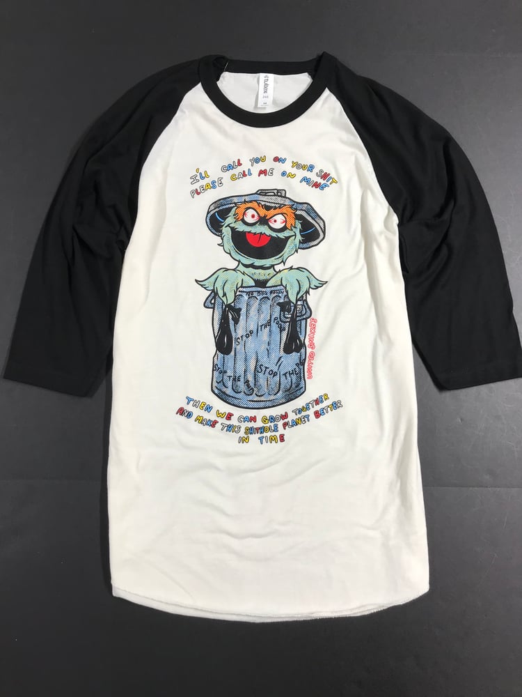 Image screen printed by hand on a UNISEX 100% ring spun soft cotton vintage white and black baseball tee shirt.