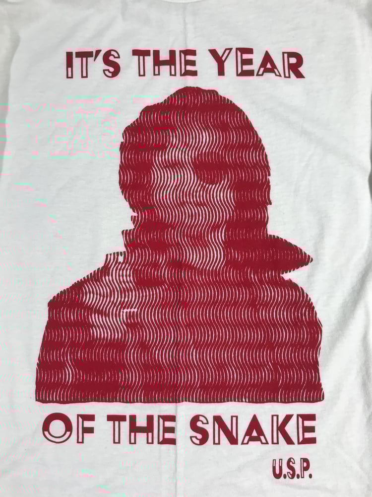 Image screen printed by hand on an off-white natural 100% cotton tee.